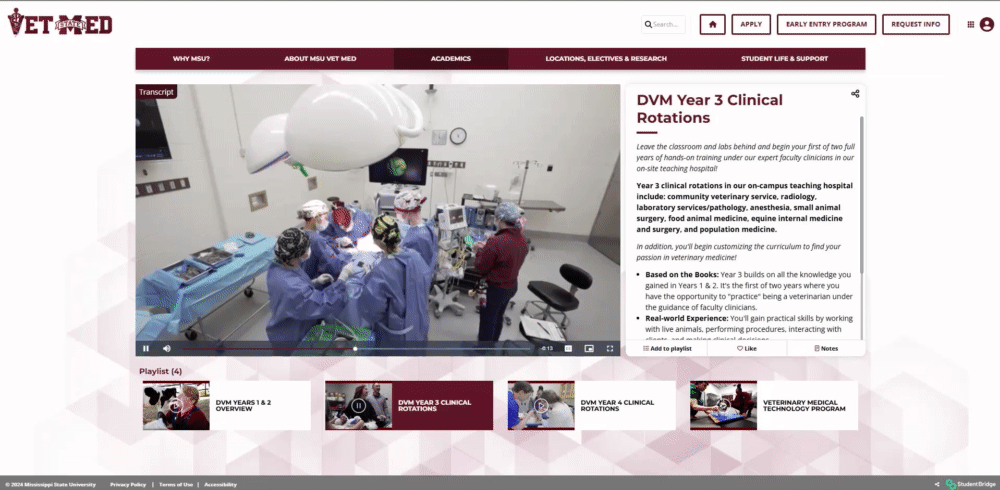 Mississippi State University's College of Veterinary Medicine sought to elevate its brand and connect with potential students and donors through compelling video content. The college aimed to showcase its unique programs, faculty, and students in a way that resonated with their target audience. To achieve this, they required a tailored video strategy on a branded web platform that would deliver authentic stories free from the distractions of social media.