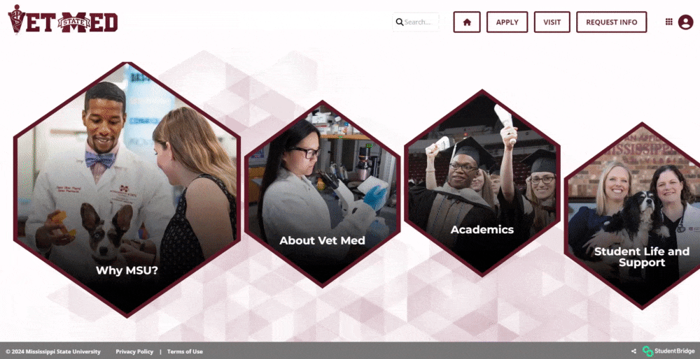 Collaborating closely with our international design team, I guided the creative process, emphasizing the integration of the College of Veterinary Medicine's unique brand elements, particularly the distinctive geometric pattern. This further cemented the site as a tool to showcase the college as an independent brand and not just a subsect of the University of Mississippi System.