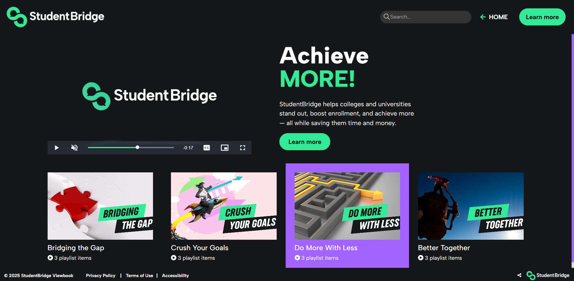 "Explore StudentBridge" was a comprehensive marketing initiative designed to introduce prospective customers to the functionality and experience of the Viewbook website. The project combined a full brand archetype analysis with the conception, production, filming, and editing of engaging video skits. These efforts showcased the innovative features and immersive storytelling capabilities of the platform, providing a clear and compelling demonstration of its value. By blending creative strategy with high-quality production, the initiative successfully conveyed the essence and impact of the StudentBridge experience.