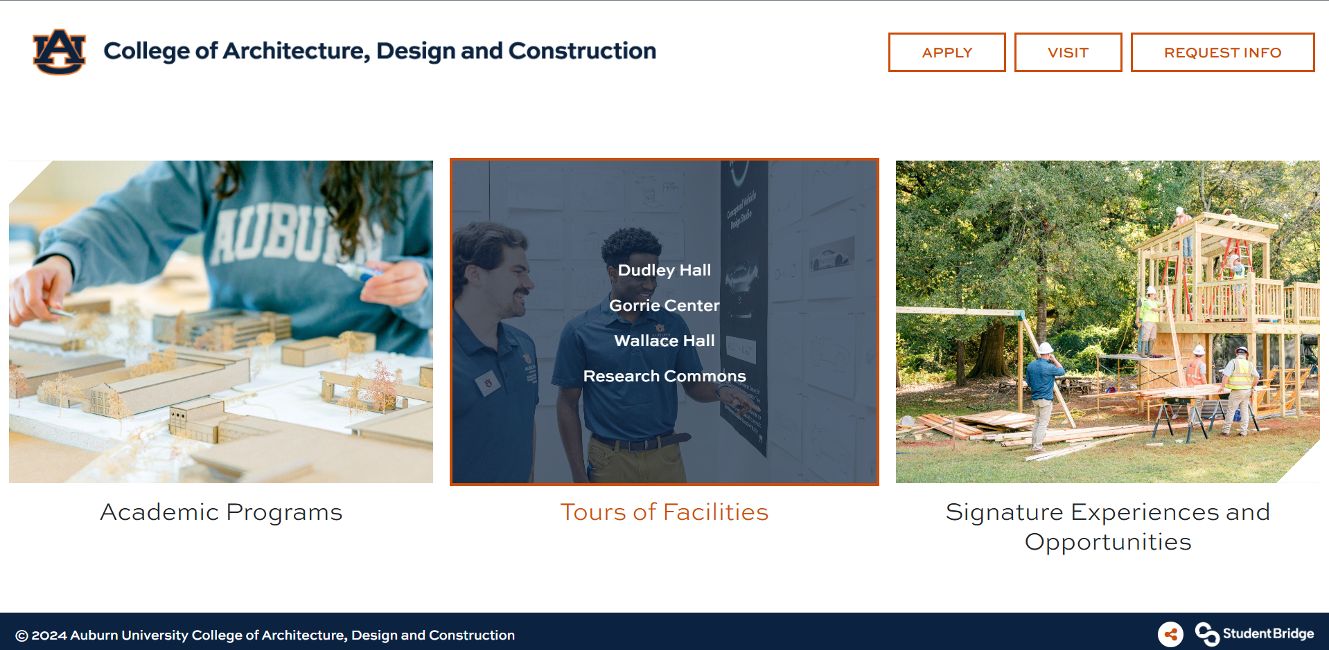 Auburn’s CADC program offers a variety of undergraduate and graduate programs. The college benefits from video production services to showcase student work and faculty expertise, and a comprehensive Viewbook website provides prospective students with essential information about the college's programs and admissions process.