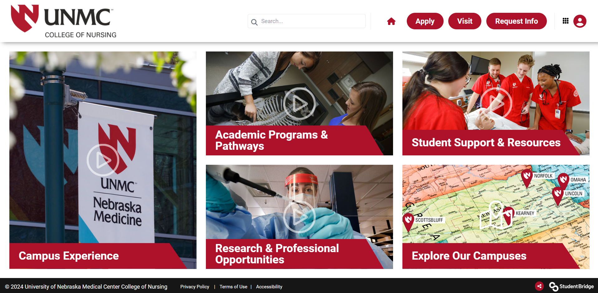 Located across a “500 mile campus,” UNMC is a renowned institution dedicated to educating future nurses and advancing the nursing profession. The college leveraged video production to showcase student experiences, faculty expertise, and clinical simulations. Additionally, interactive maps provide prospective students with a virtual tour of the campus and its facilities. A comprehensive Viewbook website further assists in informing and guiding prospective students through the admissions process